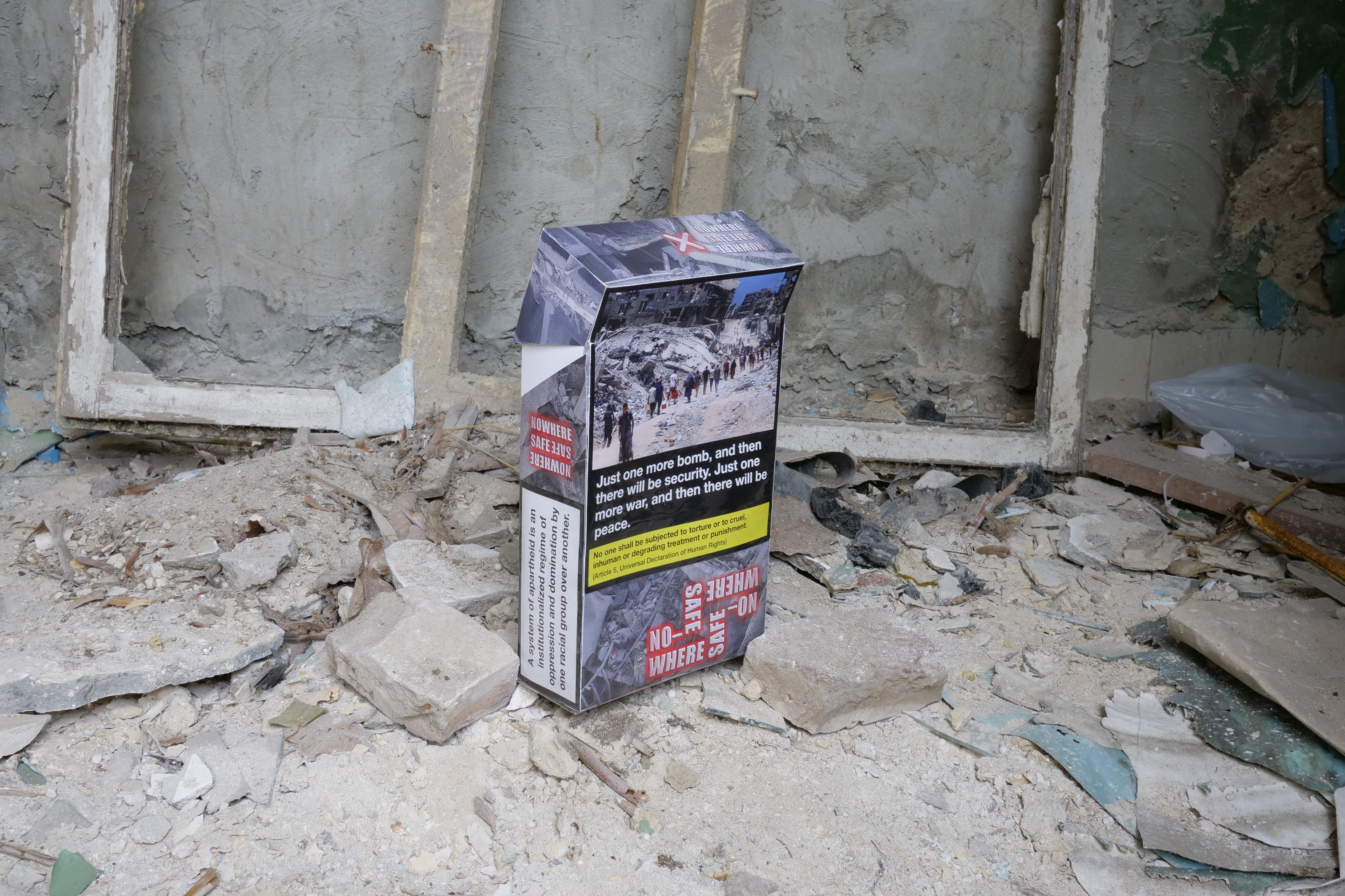 Das Design der Verpackung spiegelt das einer typischen deutschen Zigarettenschachtel wider, jedoch werden anstelle von Gesundheitshinweisen Texte und Bilder präsentiert, die ernüchternde Einblicke in die Realität der Menschen in Konfliktzonen bieten. Die Schachtel ist überzogen mit Bildern von Trümmern, vertriebenen Familien und Personen, die durch die Überreste von zerstörten Gebäuden in Gaza gehen. Diese Bilder, sind eine Erinnerung an die durch Krieg zerrissenen Leben, erzwungene Vertreibungen und systemische Unterdrückung.